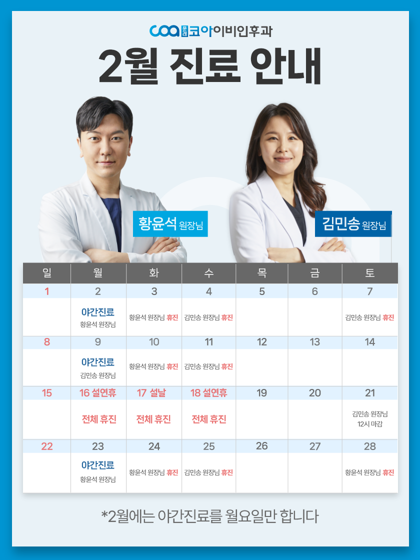 축적된 경험으로 성공적인 결과 코수술 1,000CASE+ 풍부한 경험이 만들어 낸 수술실력으로고난도 케이스까지 좋은 결과를 만들어냅니다 이비인후과 모든 영역을 체계적으로 진료 대학병원까지 가는 수고로움,문래코아에서 덜어 드립니다 3차원 고해상도 CT 장비, 수면다원검사, 첨단 어지럼 검사장비,모든 종류의 청각 검사 장비를 보유하여 멀리 가지 않아도정확한 진단을 받아보실 수 있습니다 ONE-STOP 진료 진단과 치료를 하루만에 대학 병원에서 몇주씩 걸리는 진단과 치료가2인 전문의 진료로 대기시간은 짧게, 하루만에 가능합니다